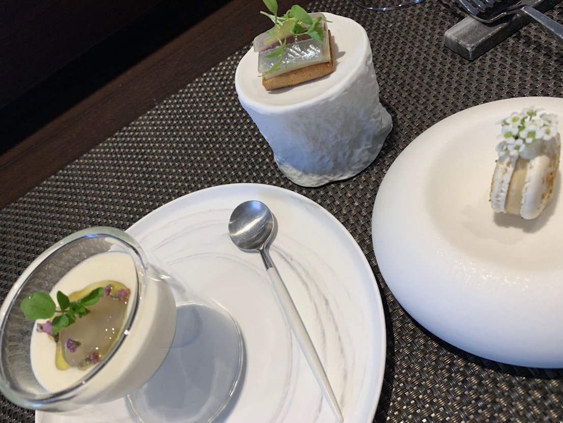 ミシュラン一つ星の「La Floraison de Takeuchi」に行ってきました。 アミューズ。新タマネギのバリエーション。三種とも新タマネギのお料理。