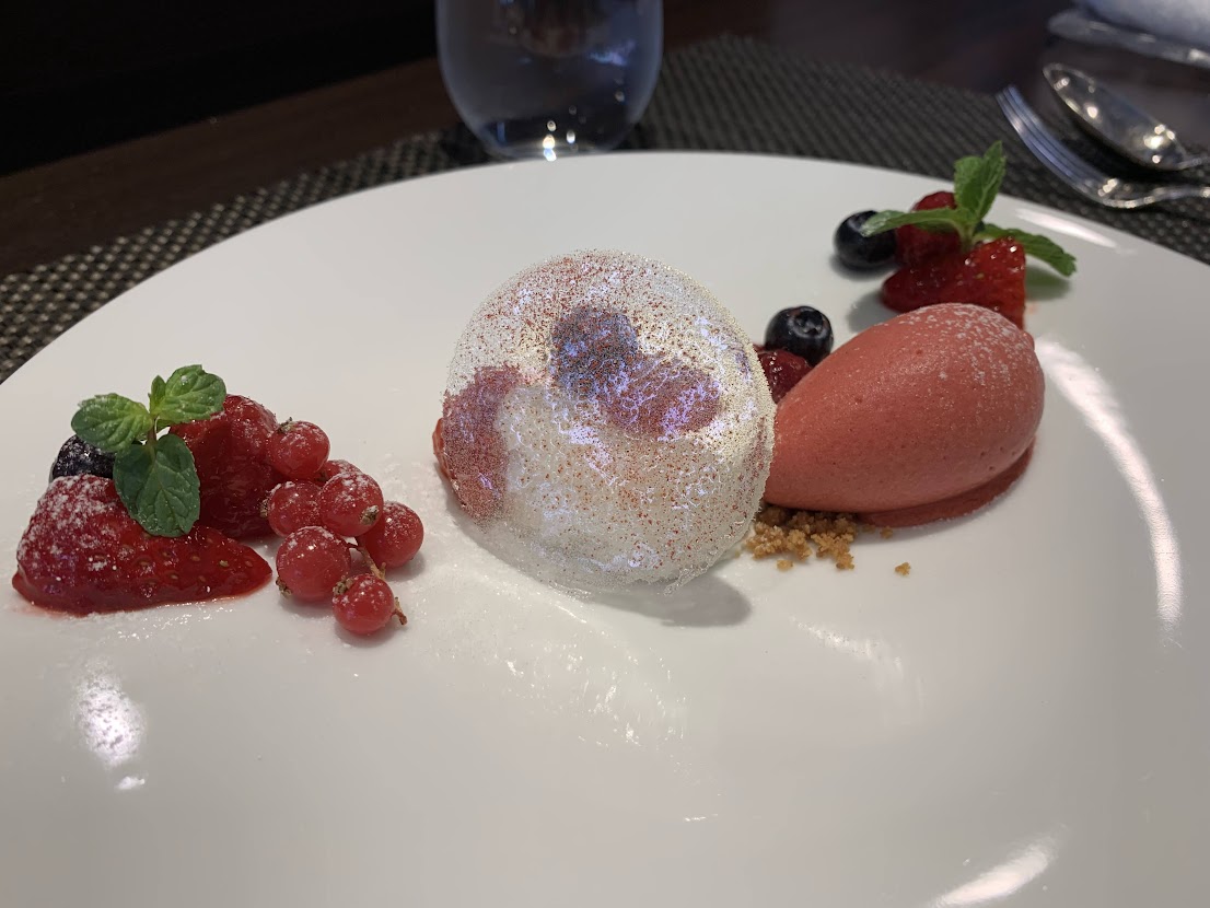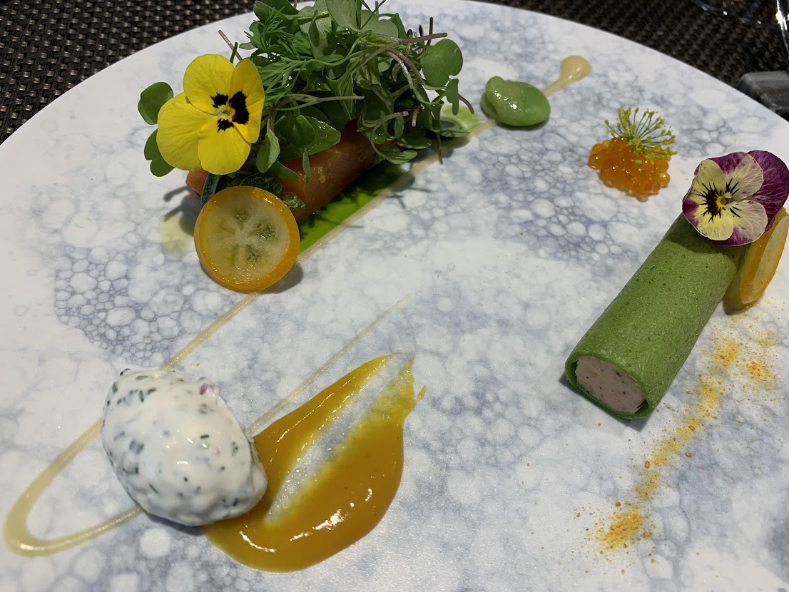 愛知県産絹姫サーモンのデクリネゾン 塩レモンのクーリとセルヴェル・ド・カニュ 知多半島の無農薬ハーブを添えて |