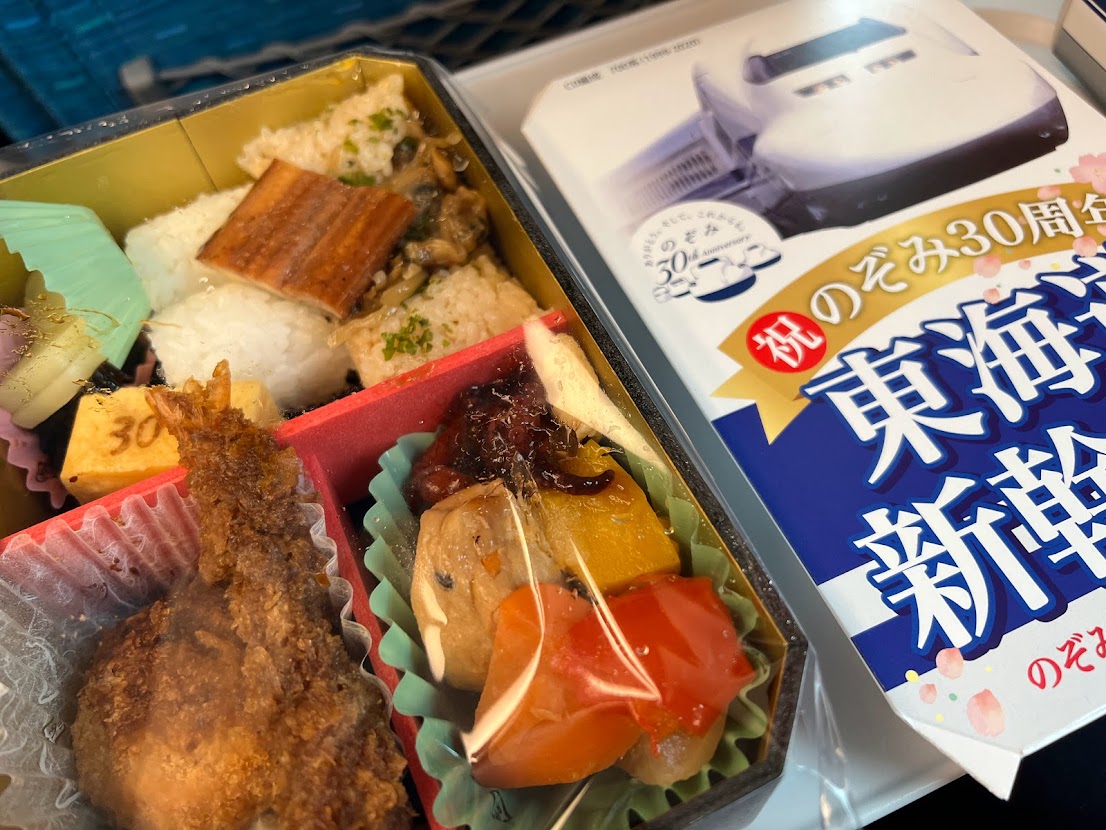 おじちゃんが亡くなったという連絡があってお別れに向かいました。 新幹線の中で「新幹線のぞみ30周年記念弁当」を。沿線各地の名物が入っているお弁当。 |