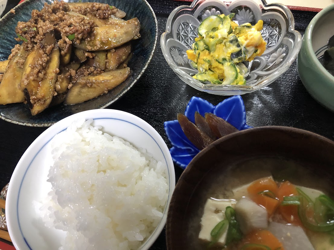 今日のお夕飯はなすのそぼろ煮、かぼちゃのサラダ、奈良漬け、こんにゃくのピリ辛煮、里芋の味噌汁。 |