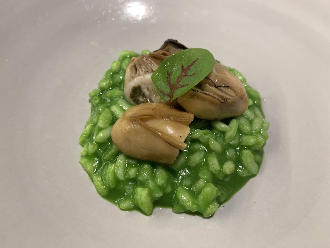 広島の牡蠣に愛知県産のほうれん草のリゾット。見た目鮮やかなひとさら。 |