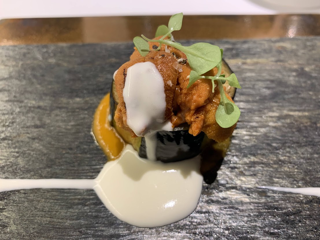 愛知県産なすの素揚げと北海道産うに。マスカルポーネチーズのソース。 |