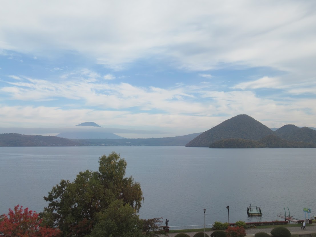 ホテルの部屋から見る洞爺湖。羊蹄山には雲がかかっています。 |