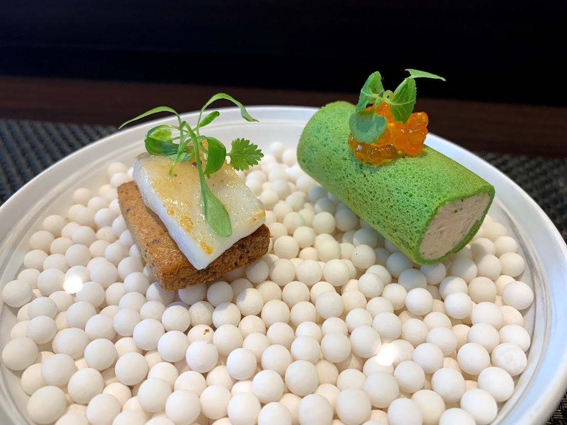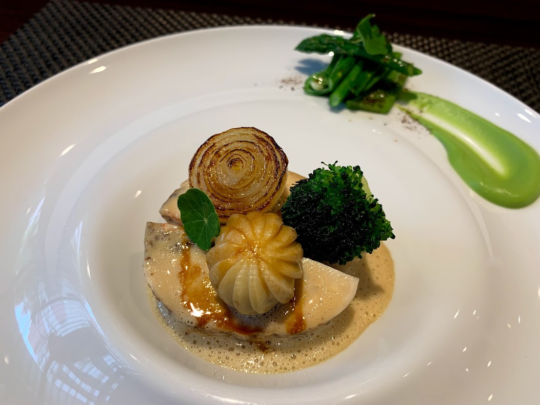 モリーユ茸の香る三河赤鶏のパロティーヌ仕立て。色鮮やかなブロッコリーのピューレと春野菜。ソースアルビュフェラ。 もうなんのことかわかんないけど、ともかくおいしいやつ。 |
