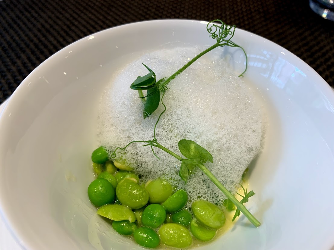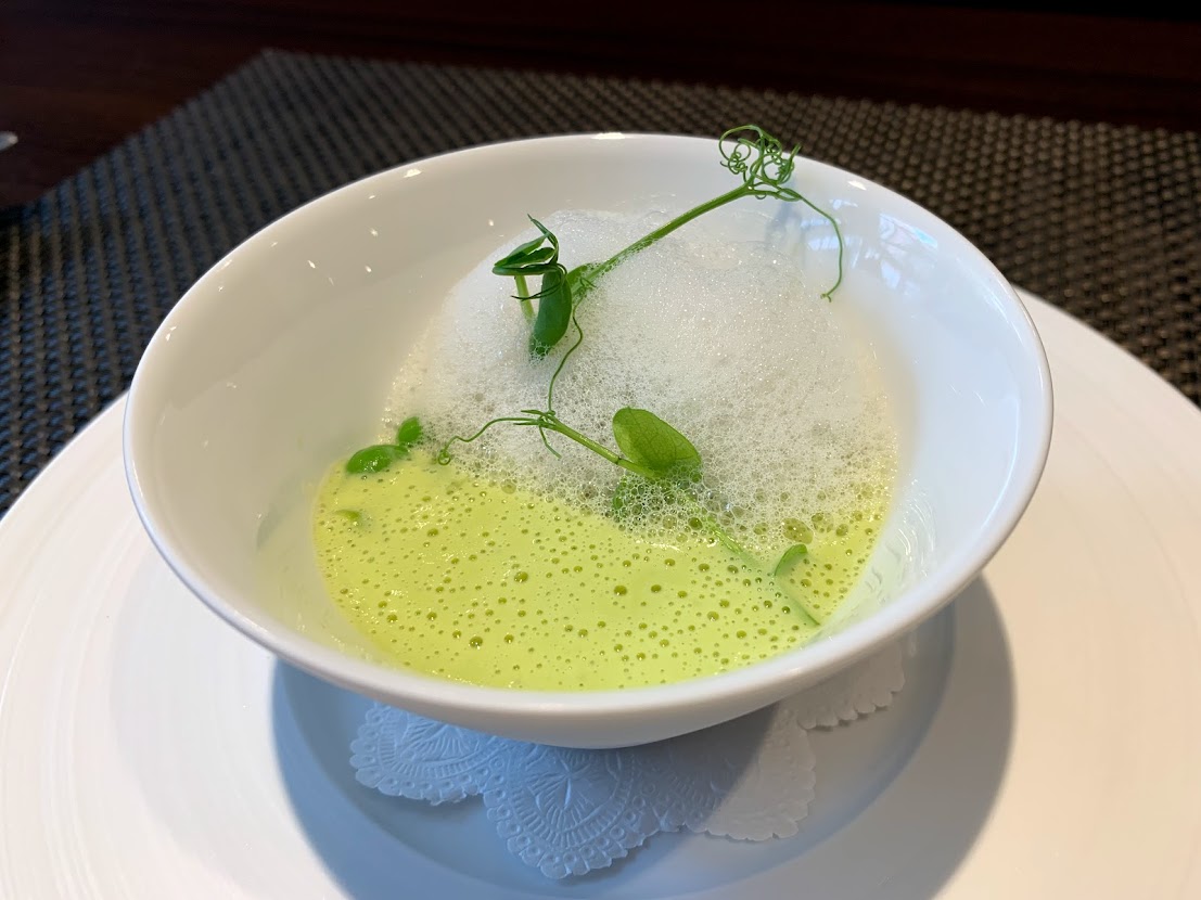 春豆とベーコンのロワイヤル ラ・フロレゾン風。どんな風かわかんないけれど緑が鮮やか! あいち鴨のブレザオラ(牛肉の生ハム)を添えて |
