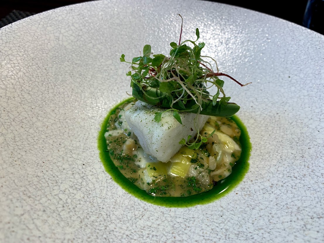 長崎県産のハタ。優しく火入れをして旬の山菜を添えて。 ホエーとフレッシュハーブのマリニエールソースでいただきます。 きれいな緑だねー |