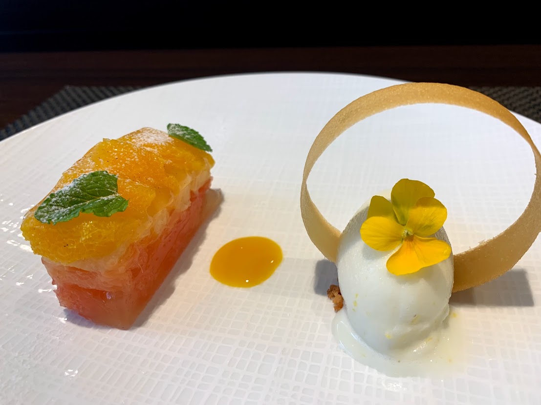 デザート。 4種類の柑橘で作ったケーキとレモンのソルベ。 |