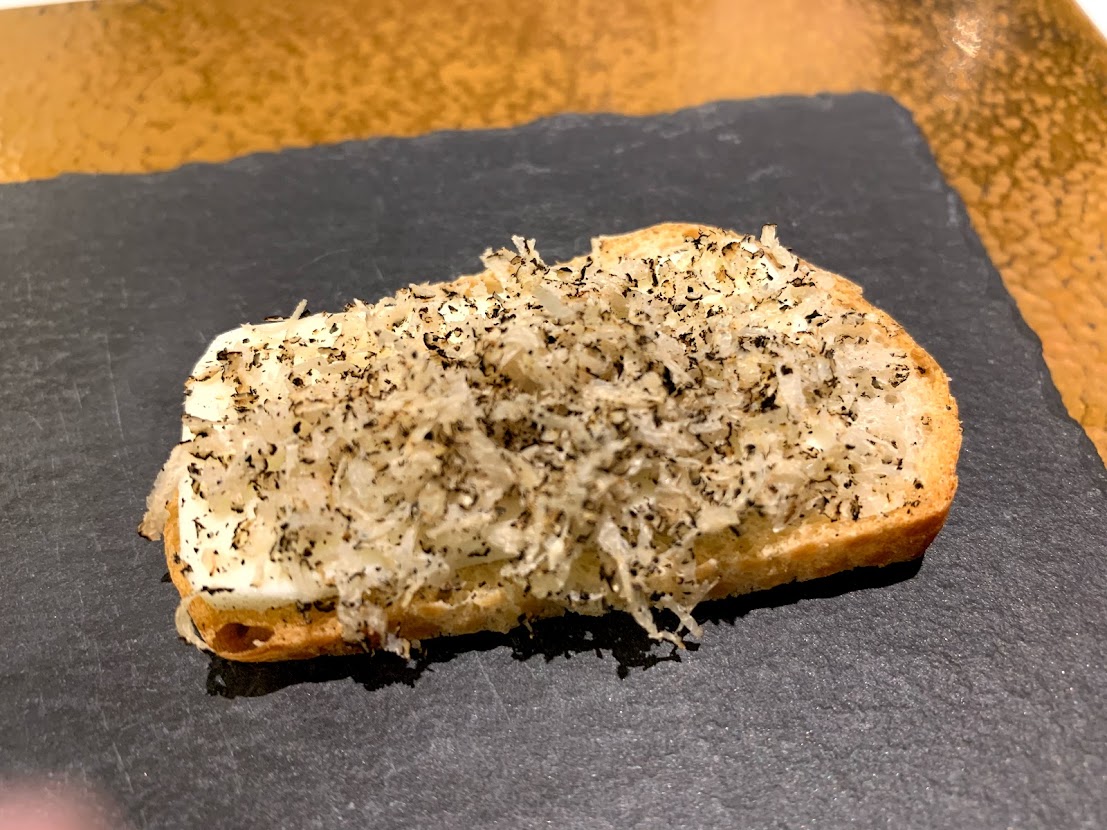 定期的にお邪魔するミシュラン一つ星レストラン「セッタンタ」。 今日もおいしいものいっぱい、いただきます! アミューズはトリュフいっぱいのトースト。イタリア産の水牛のバターの上にはたっぷりのサマートリュフ。香りが口の中いっぱいに広がる幸せの素。