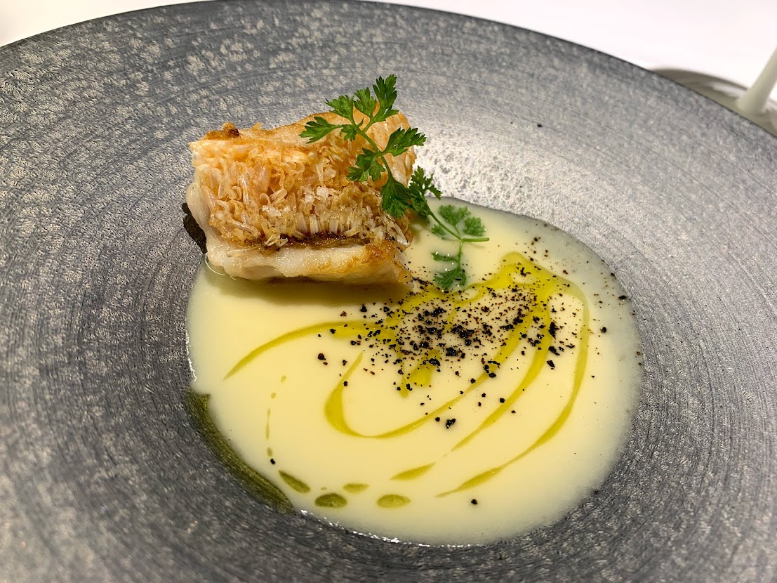 お魚料理は山口県産の甘鯛。うろこがパリパリに立ってます。ソースは愛知県産のひよこ豆で。 |