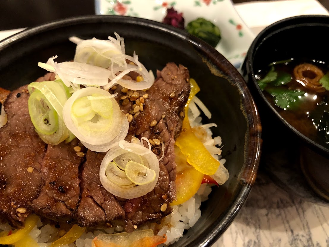 〆のご飯はステーキ丼。これ、ほんとうに柔らかいお肉でおいしかったー 相方は天丼でした。でっかい海老が2匹もついてたよ。 |