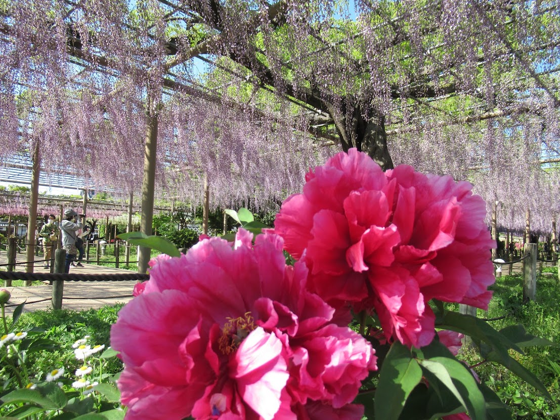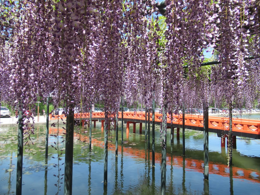 長さ275メートル、5034平方メートルの藤棚です。 藤が水に映って倍楽しめます |