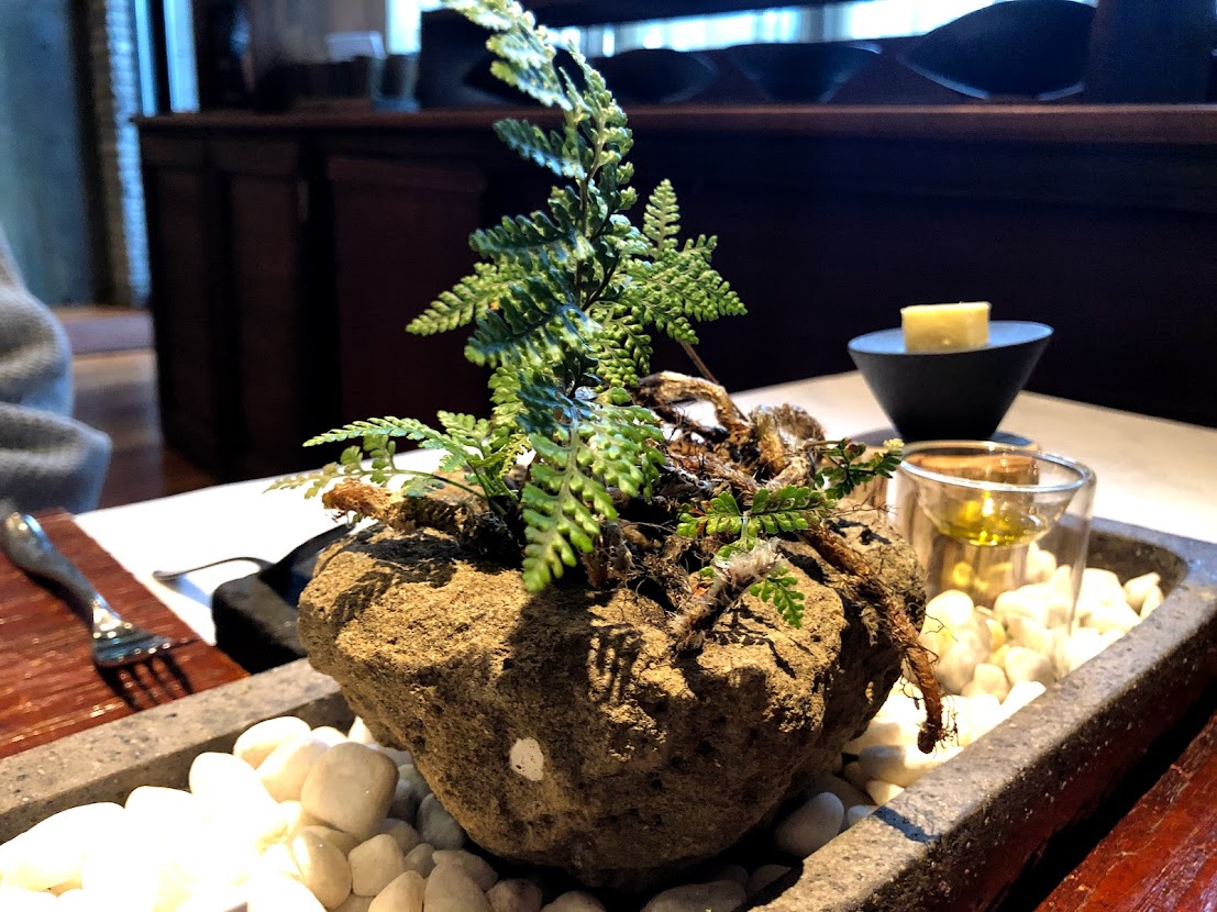テーブルの上には苔玉。 オリーブオイルとバターも。 |