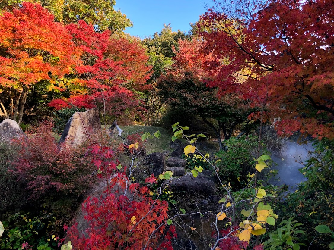 日本庭園の中に流れる渓谷には霧が出る装置があって、時間になると霧が立ちこめて幻想的な雰囲気になります。 今日はお天気が良すぎてたちこめる前に蒸発しちゃうけれどね。ちょっと霧が出てるよねー |