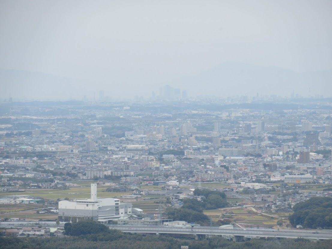 食事の後は「村積山」登山。 「熊野神社」のすぐ横に登山口があります。 1時間ほどで頂上です。 遠くに名古屋駅あたりも見えます。 |
