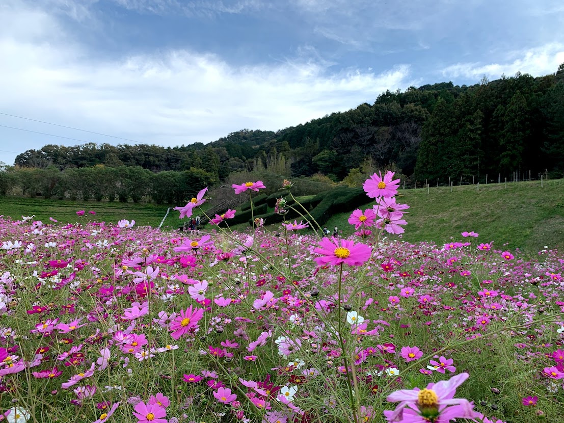 陣屋が見えてきました。コスモス畑の向こうに「ジンヤ」と刈り込まれた木が見えます。 |