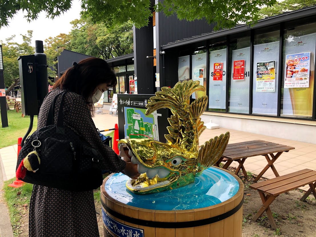 水飲み場。金シャチっていうのがいいよね。 名古屋の水道水は木曽川から取水していて、大都市のなかでもっとも硬度がひくく、まろやかな味。残留塩素濃度も最も低く、おいしいお水なのだそう。 お友だちがお水をくんでいます。 |