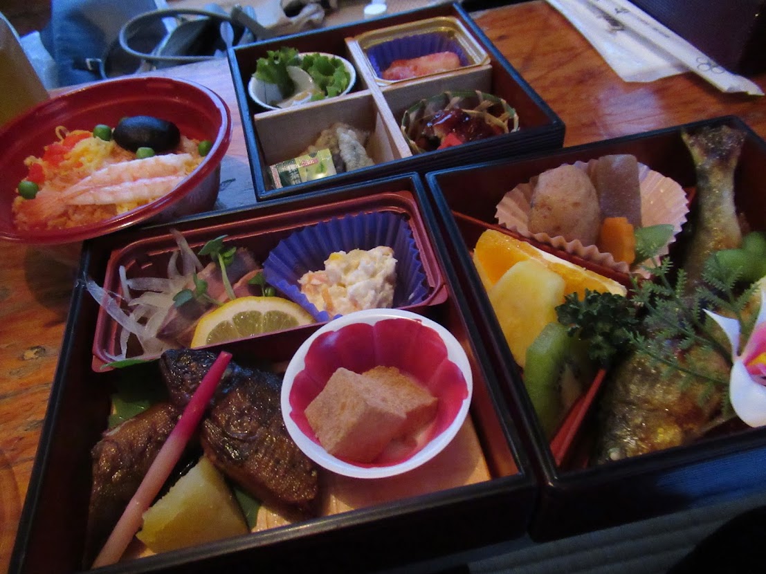 鮎一匹塩焼きが入っています。鮎の甘露煮も!ごちそうですー 木曽川を遊覧しながらいただきます。 |