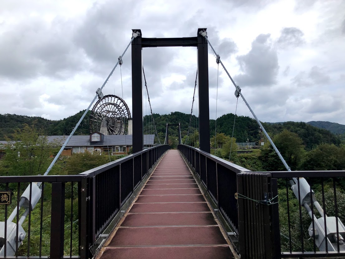 吊り橋を渡って道の駅へ戻ります。道の駅にある巨大木星水車は日本最大のもの。ダム建設によって水没した地域に多くの水車があったことからこの地域にシンボルとして造られました。直径24メートル。近くで見るとでっかいよー。 |