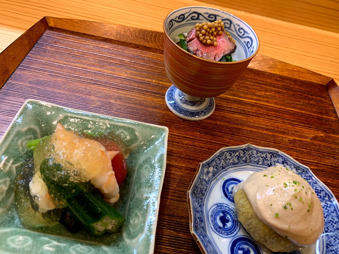 京都二日目の夜はミシュラン一つ星の「京料理・藤本」さんへ。 一日暑かったからねー。おいしいお料理で癒やされたいです。 |
