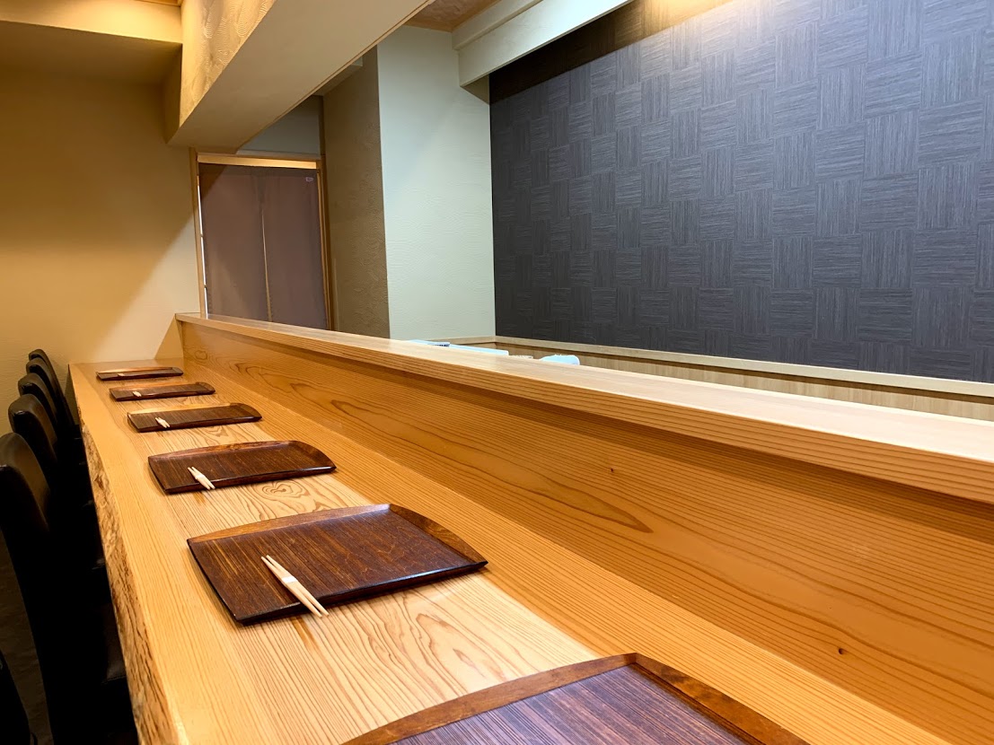 長いカウンターは1枚板で。いつお客さんが来るのかなぁって思ってたら、ここも貸し切りだった。二人のために…申し分けない気になります。 |