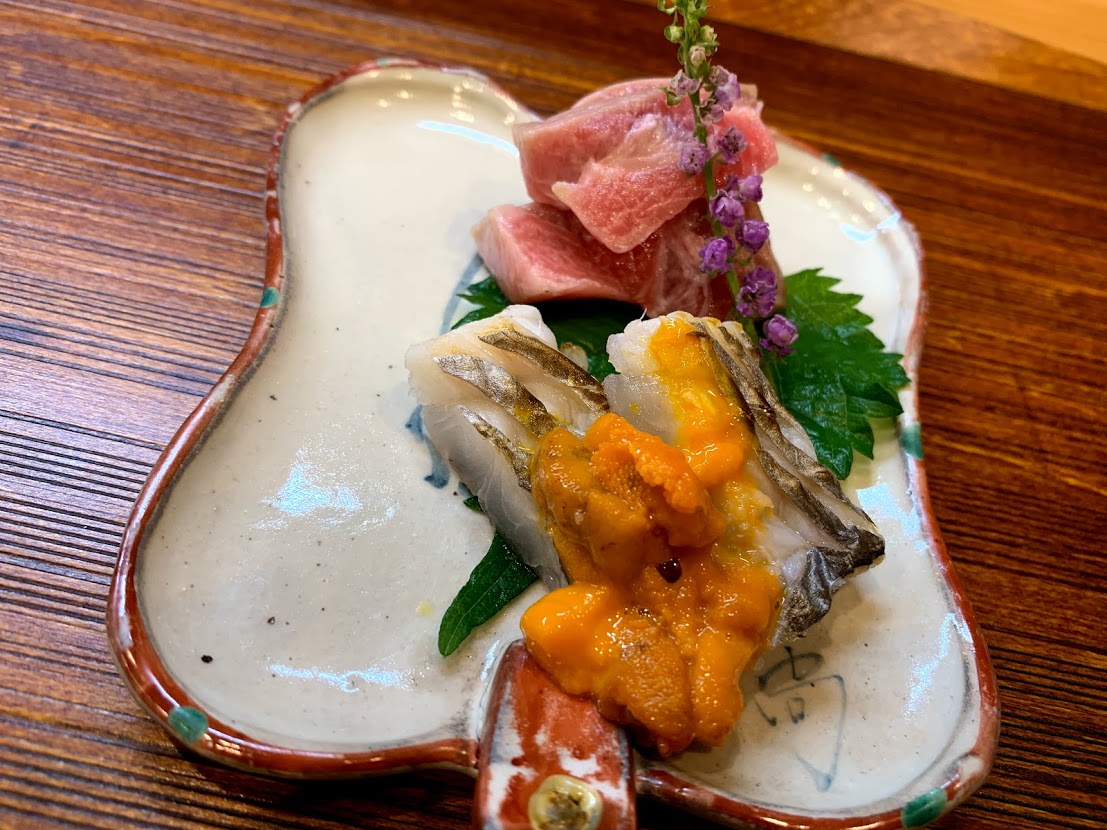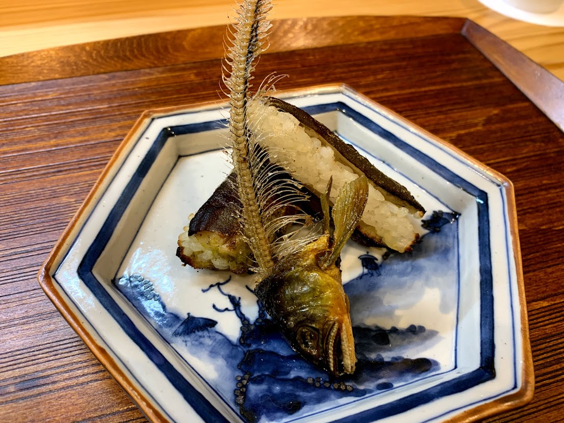 鮎のお寿司。新鮮な鮎は骨がするりとこんなふうに抜けるんだって。 |