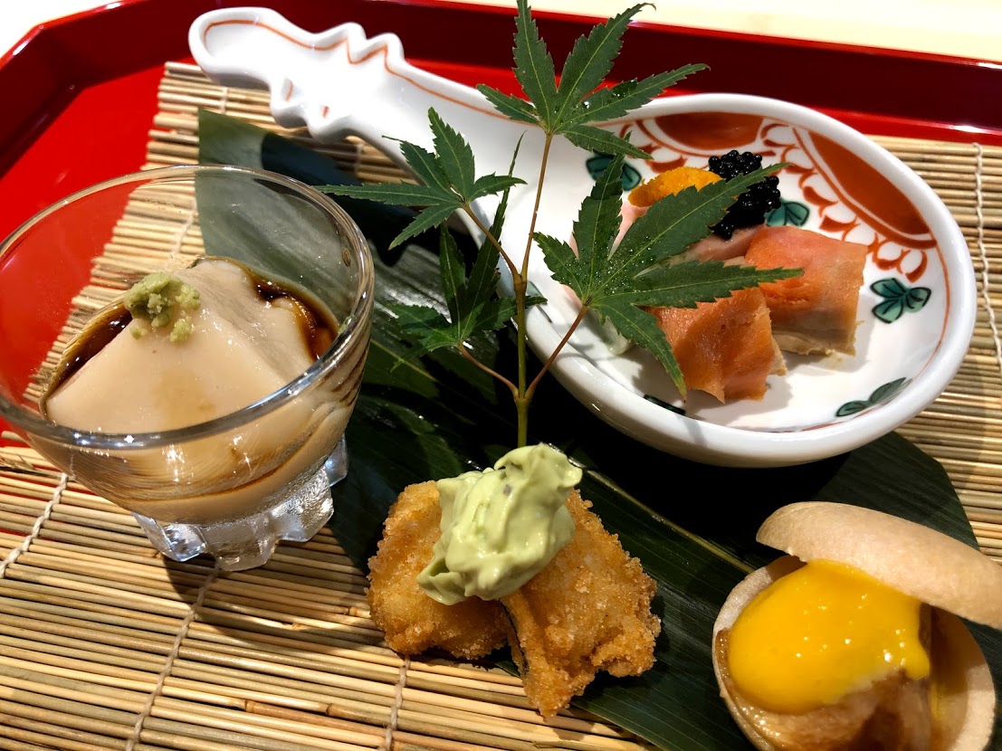八寸。 右下には桃の最中。今日いちばんのヒット。スイーツとしてではなく、ここに持ってきたあたりがすごい。 |