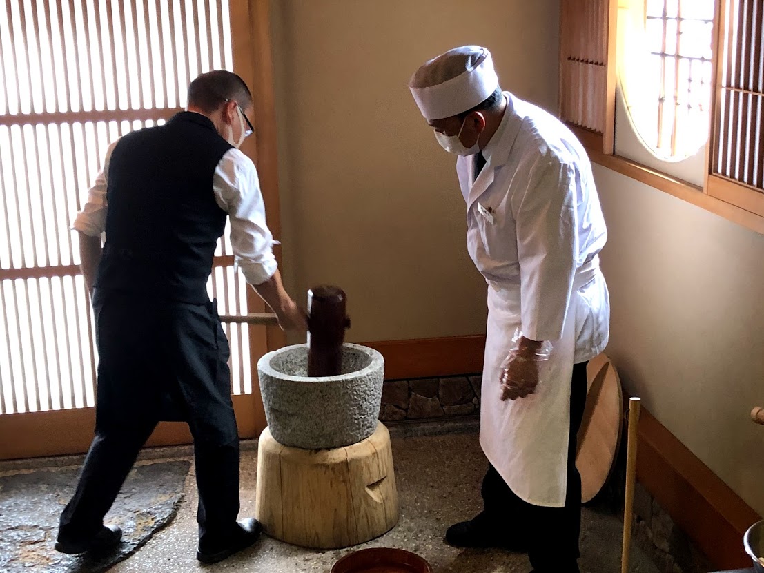 お餅つきがはじまりました。二人なのに申し訳ないですー。 シメに京風お雑煮がでます。 |