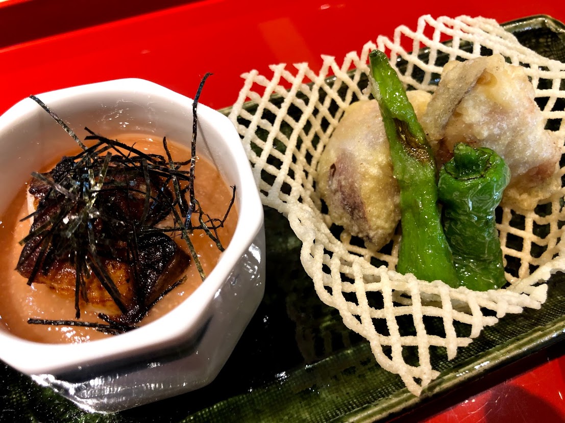 右側のかごにはいっているのはイチジクの天ぷら。 甘みが強くておいしい−。かごも食べられるよ。 左は鰻と明太子のあんかけ。これも初めての味。おいしいです。 |