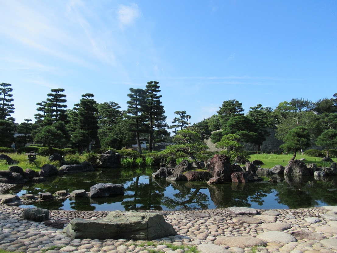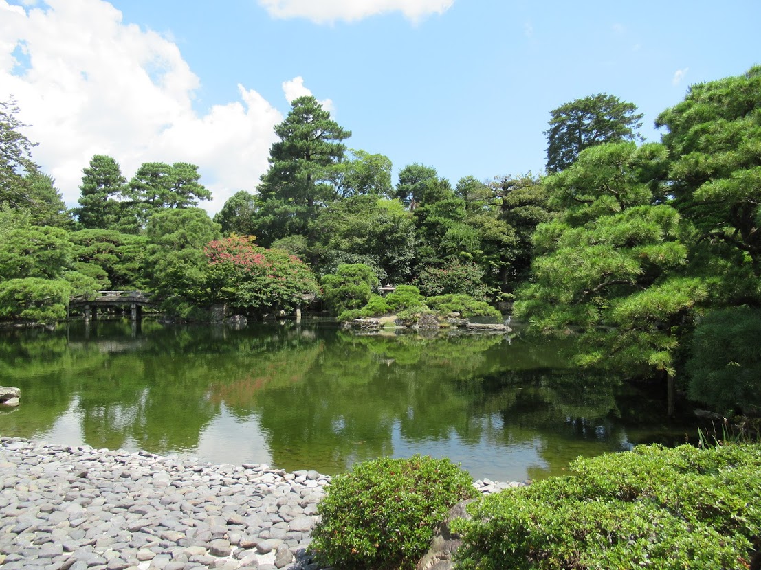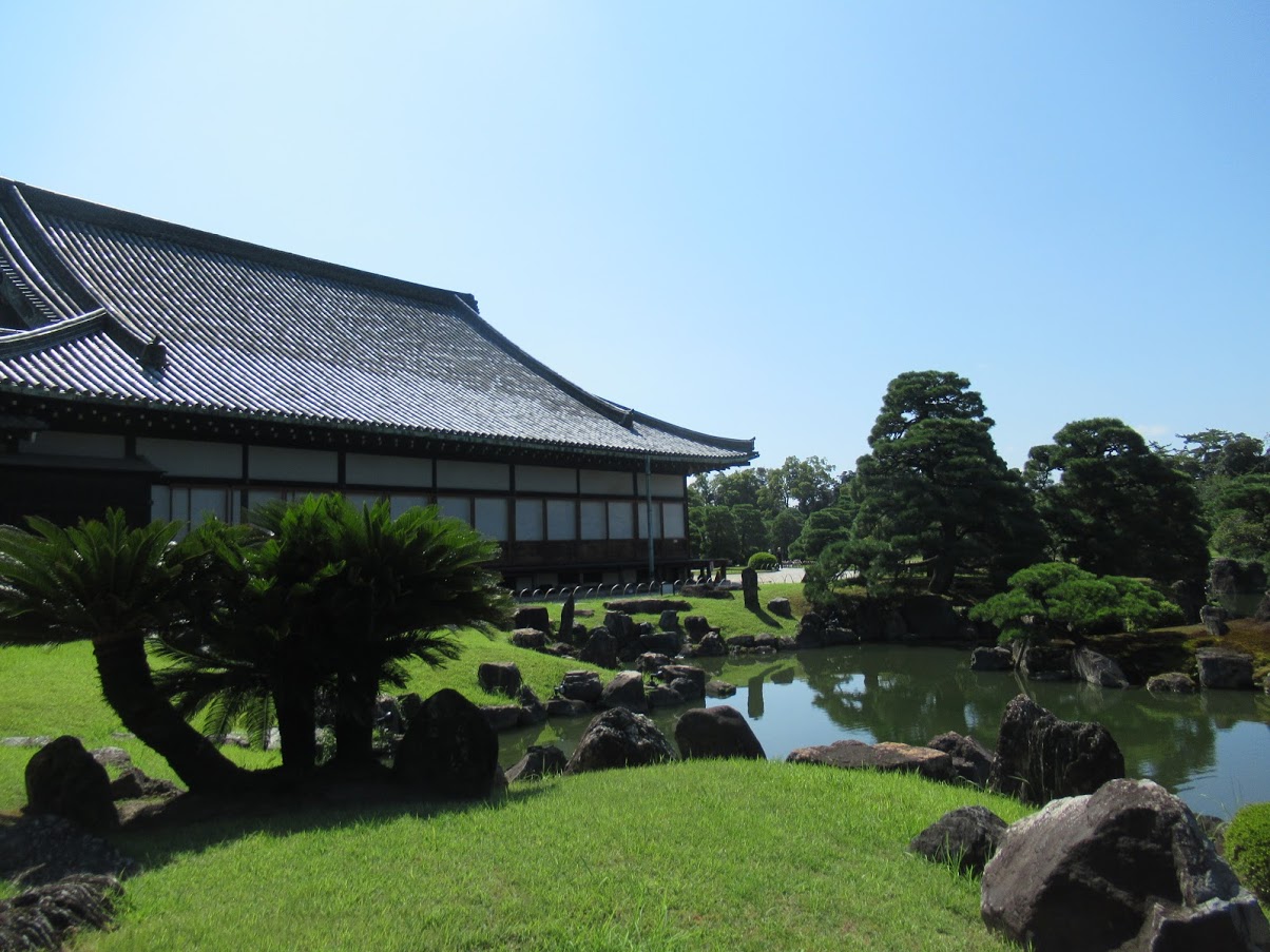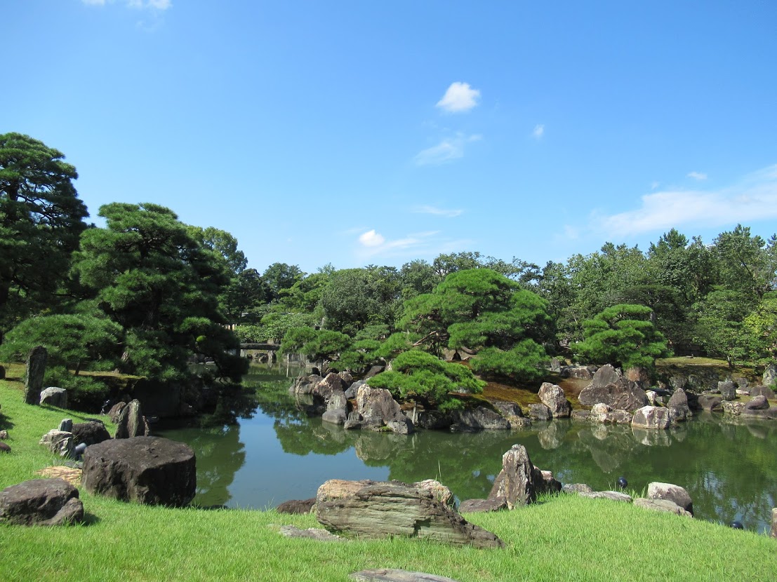 「二条城」二の丸庭園。 天気が良くて青空と木々の緑がまぶしいです。 |