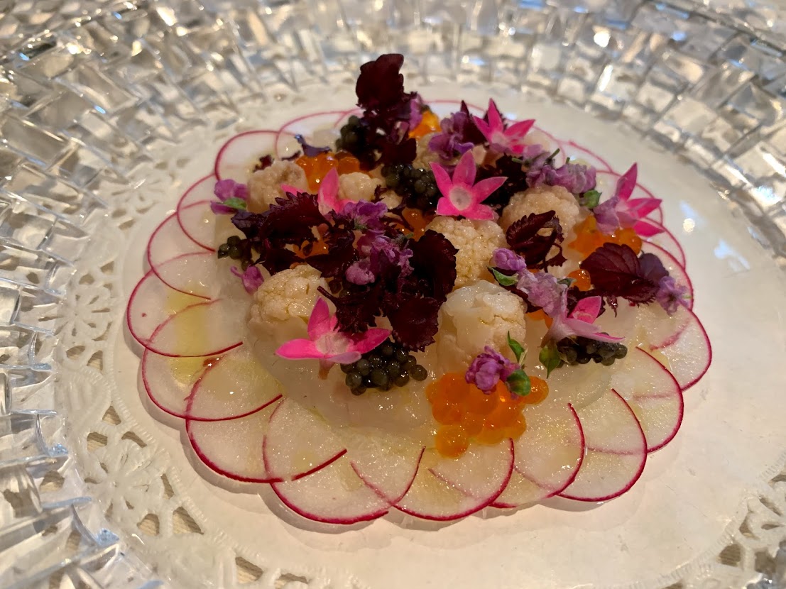 アミューズはキタムラのスペシャリテ、タマネギのキッシュ。 続いて桃の冷製ポタージュ。中には蟹をコンソメで固めたジュレが隠れていました。 写真は冷製の前菜。愛知県産のヒラメのマリネ。キャビアとカリフラワーで飾って。 |