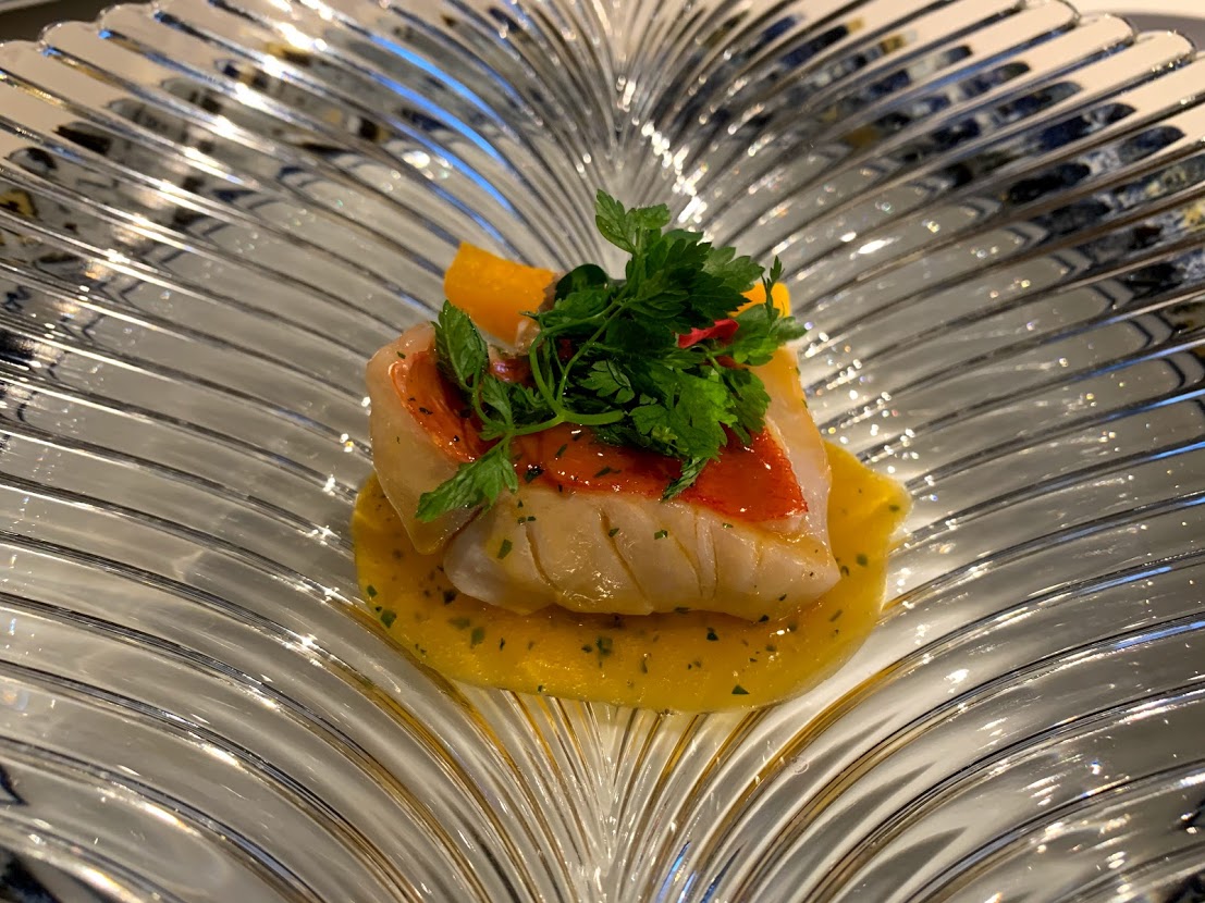 お魚料理。 銚子沖・金目鯛。千葉産バターナッツ南瓜をそえて。 磯の香りただよう濃厚ソースがおいしい。 |