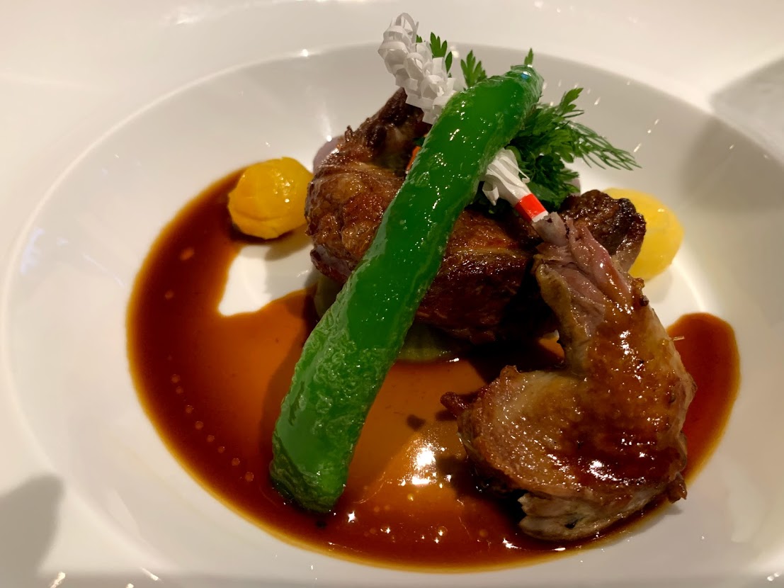 お肉料理。 写真はフランス産の仔鳩のロースト。これは相方のオーダー。 私は鳩が苦手なので愛知県産牛フィレを頼みました。 |