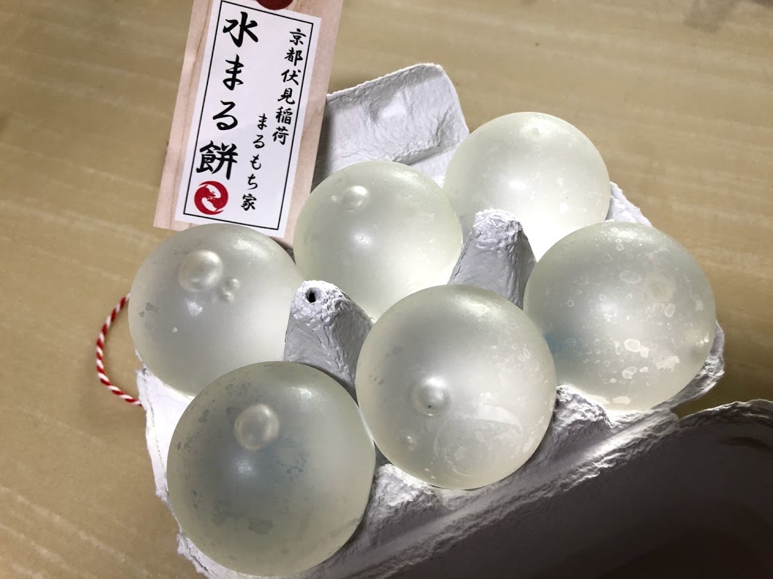 「先生、なにかほしいものなーい?」って聞いてくれたのでリクエストした「水まる餅」。丸い餅に針で穴を開けるとお餅が出てきます。ぷるんぷるん。 |