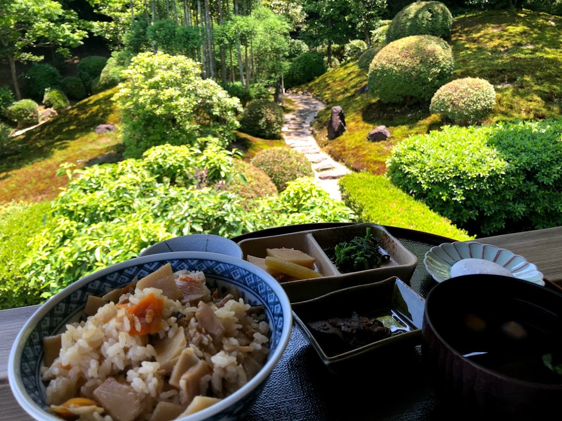季節ごとの定食があって、春はタケノコご飯。 お庭を見ながらいただくのはとても贅沢です。 |
