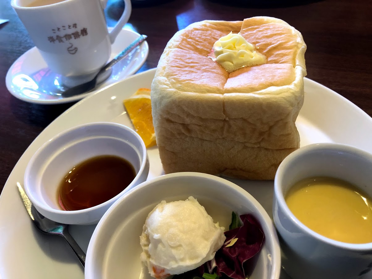 香嵐渓へ行く前日はお友だちとモーニングへ。 「ことことや」さんのふわふわ食パンは小さいけれど一斤出てきます。 ふわふわだからぺろりと食べられるんだけどねー |