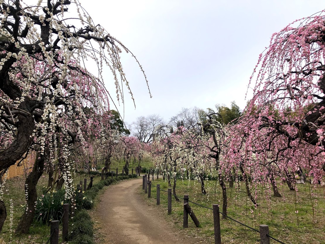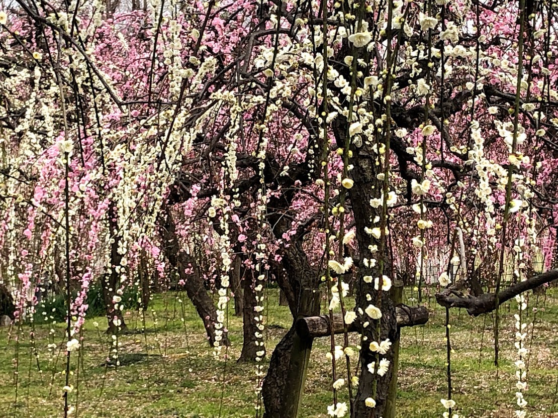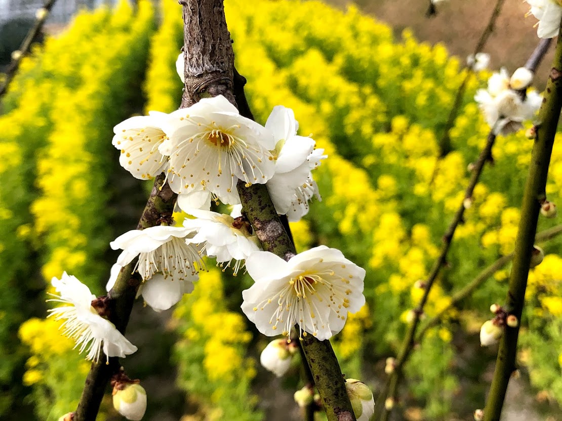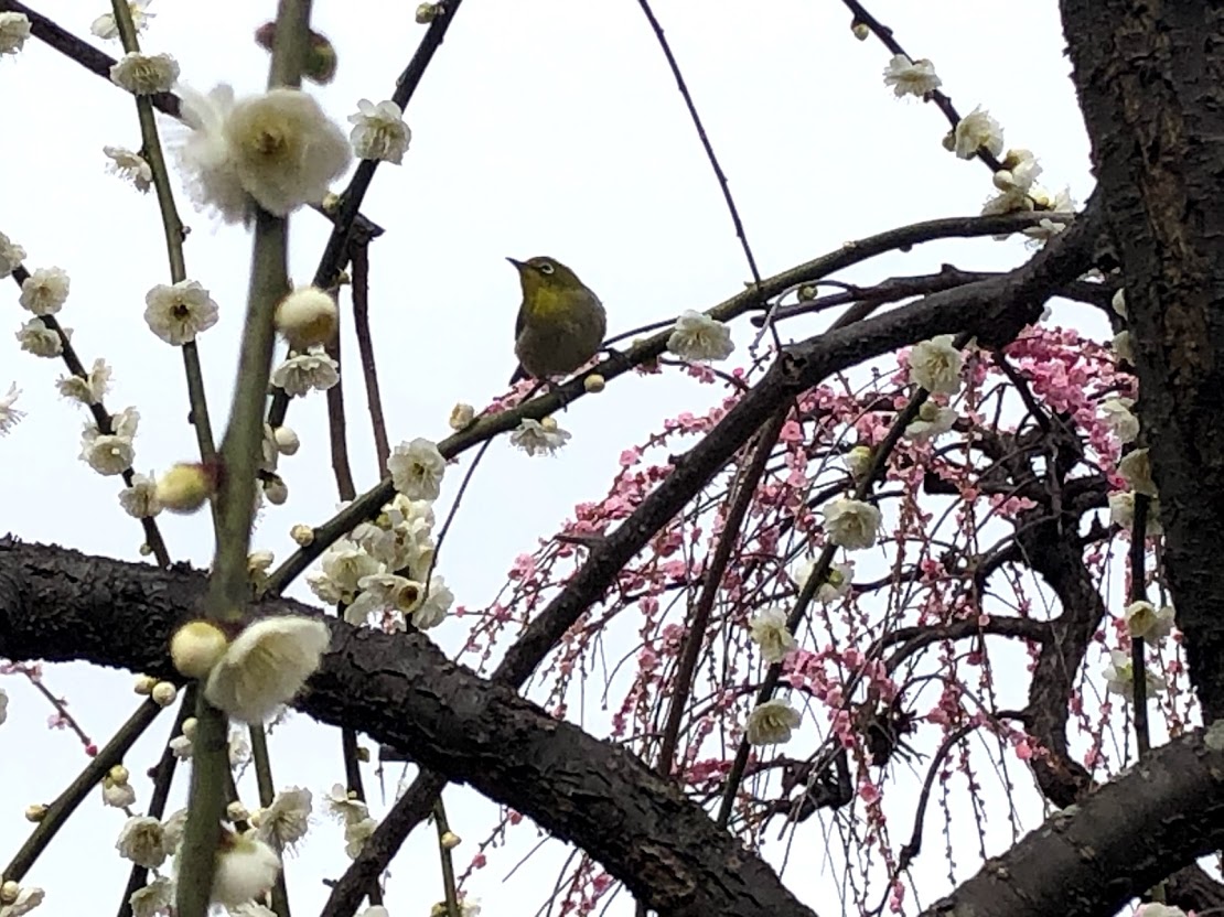 しだれ梅や約700本。今が盛りですが、武漢肺炎ウイルスの影響で訪れる人は少ないです。 あーメジロです! |