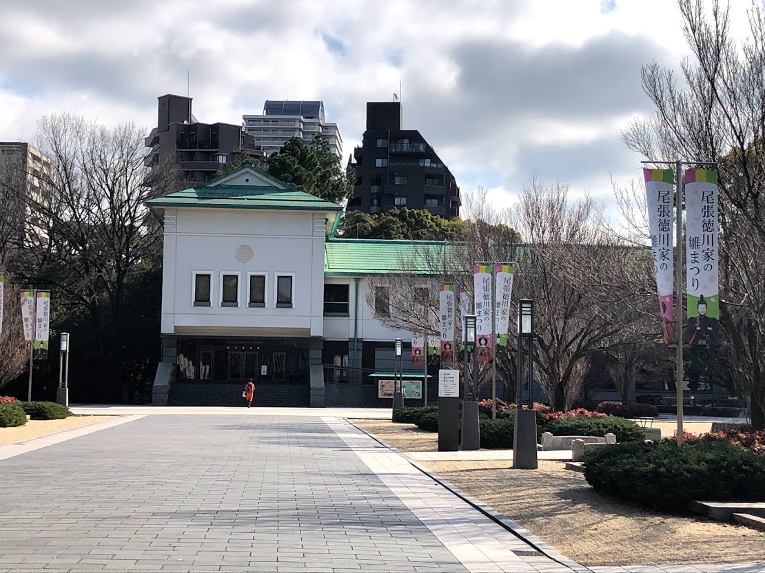 「黒門」をくぐると正面に「徳川美術館」新館が見えます。美術館でとても人気のある「ひな祭り」展。ランチの前にまずは見学。大名家の豪華なひな人形が館内いっぱいに飾られています。 |
