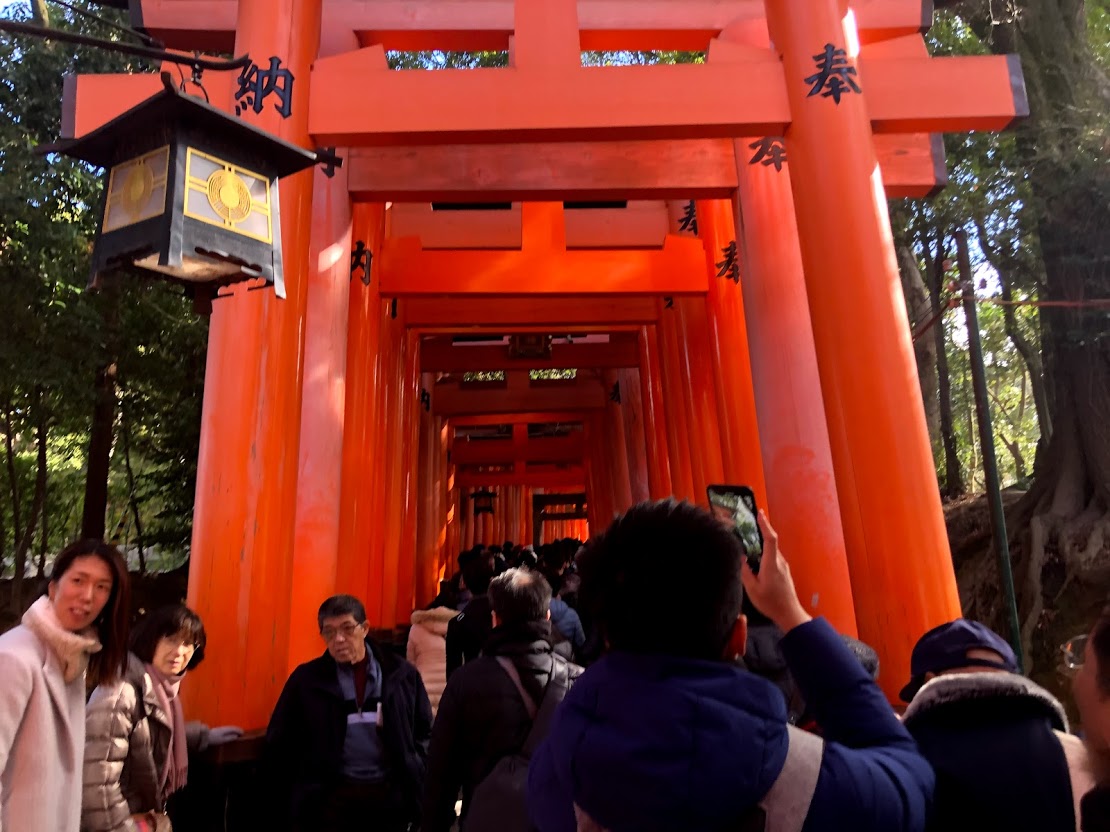 初詣は京都の伏見稲荷。 全国に3万社ある「お稲荷さん」の総本宮です。 お正月の間は少し離れた駐車場からシャトルバスで。 たどり着けるのか…という人出です。 |