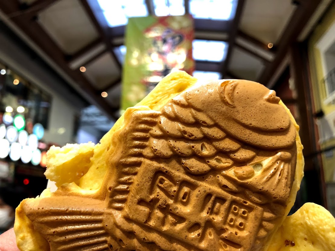 「大須商店街」 で、たいやき。「招福」たいやきは鯛の顔が笑顔なんです。
