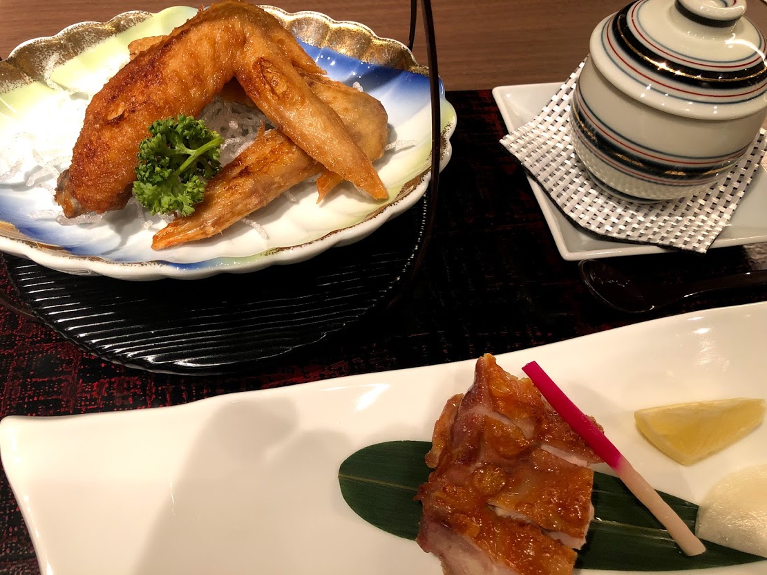 名古屋コーチンづくし。 名古屋コーチンもも肉の塩焼き、名古屋コーチン手羽先の唐揚げ、名古屋コーチンの茶碗蒸し。 |