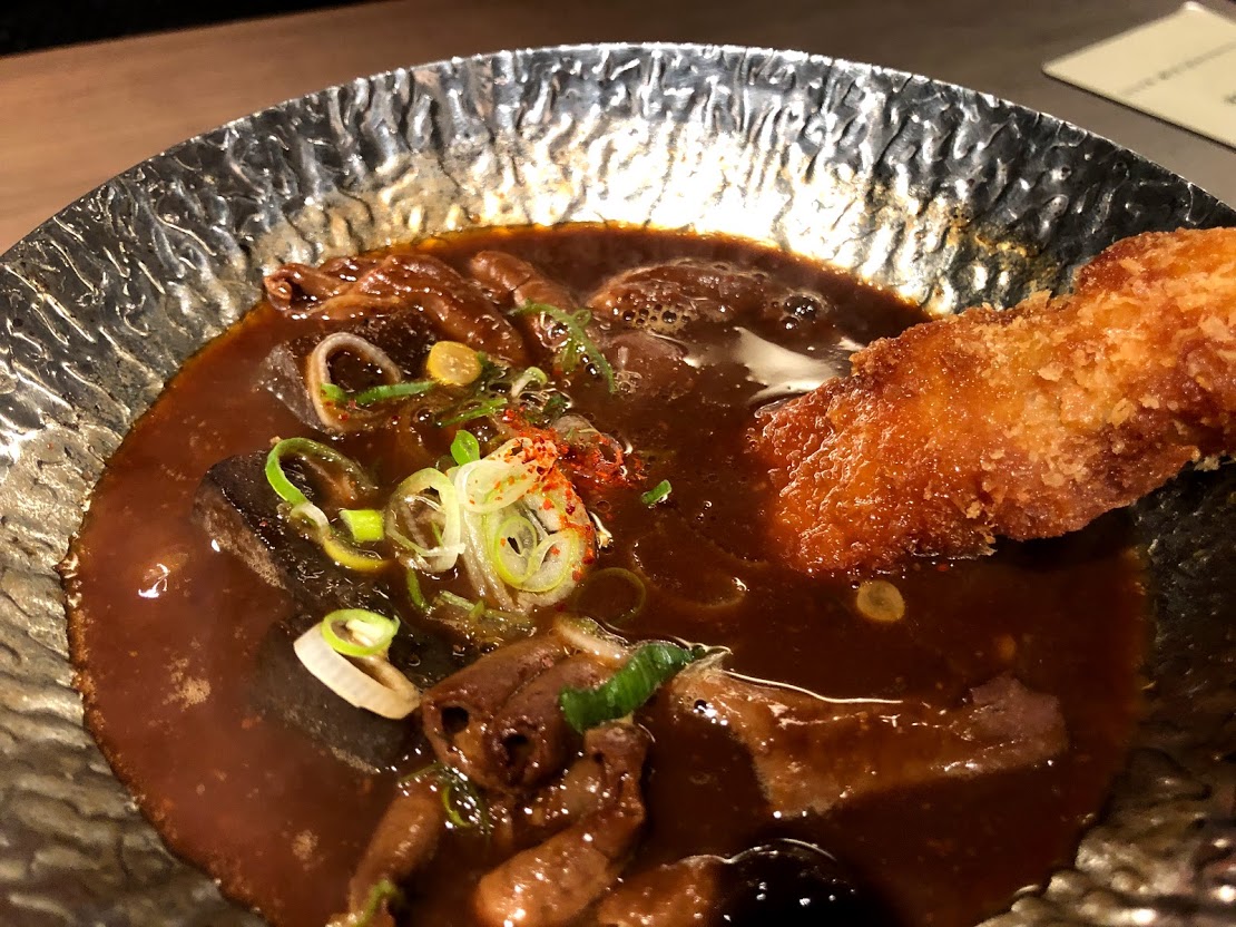 土手煮モツ鍋と三河豚の串カツ。土手味噌につけていただきます。