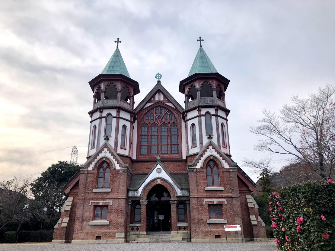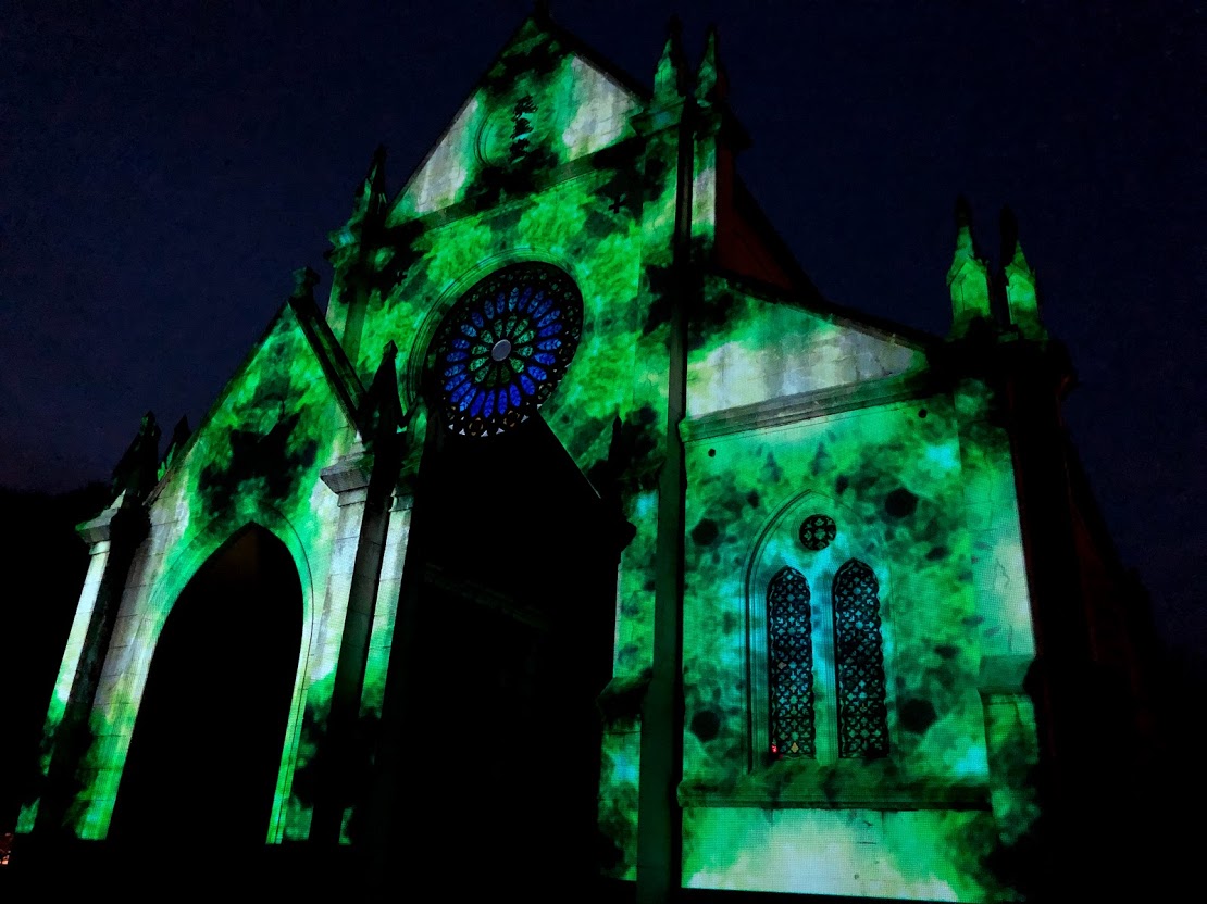 「聖ザビエル天主堂」ではプロジェクションマッピングも。 ここのバラ窓のステンドグラスはガラスに絵を描いたものなんだって。 |