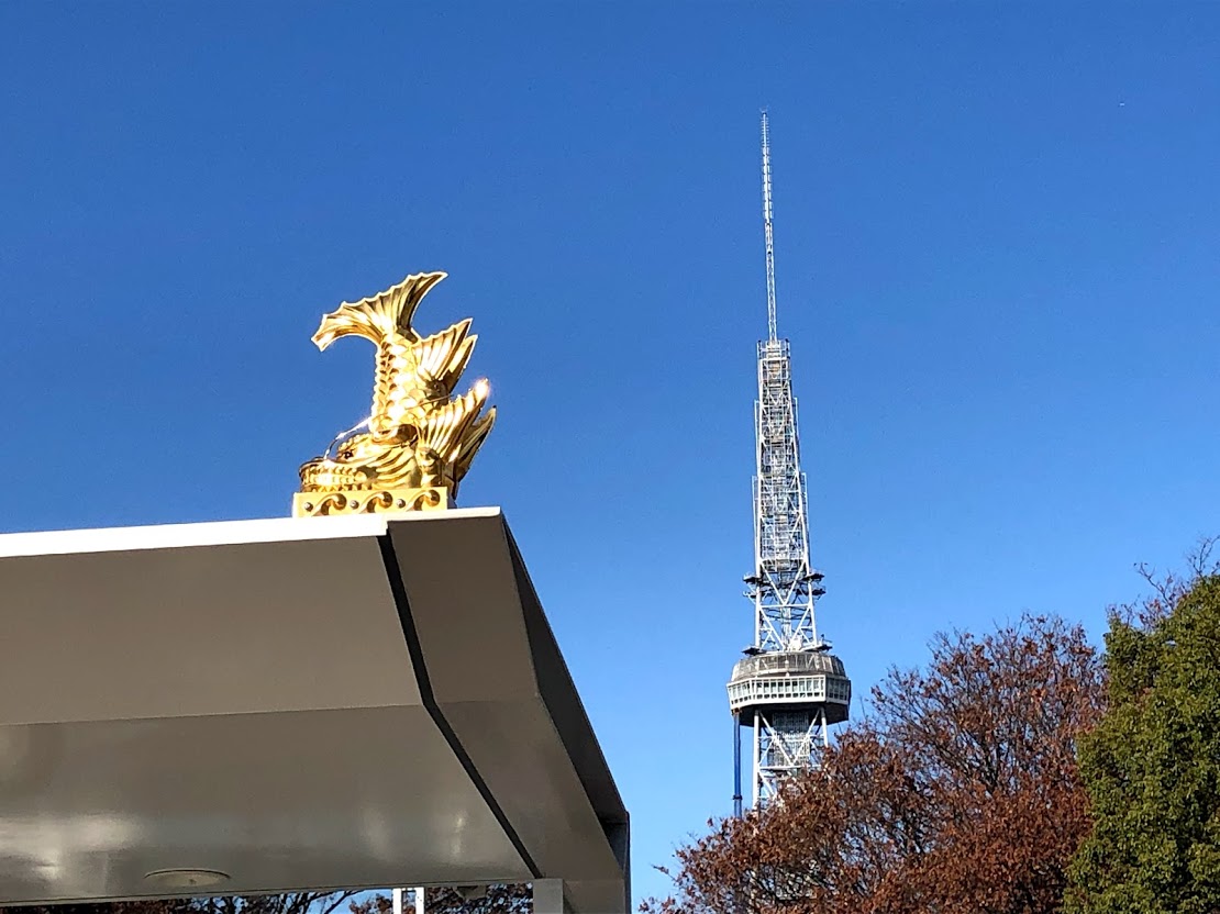 名古屋市バスの「栄」バス停。 金のしゃちほこが輝いていましたー |