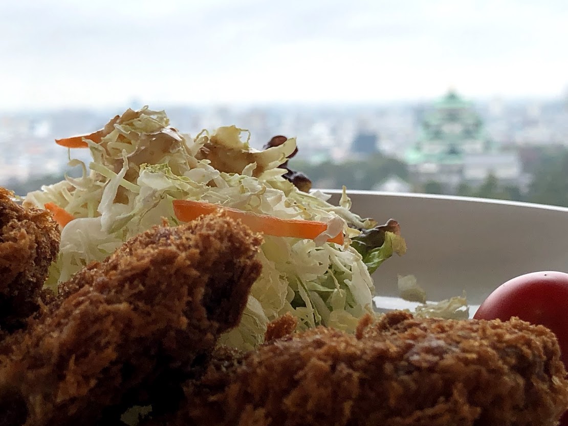 実はこの建物、病院なんです。病院の最上階のレストランは名古屋城がどどーんと見えるロケーション。窓際の席で景色を楽しみながらランチをいただきます。 |