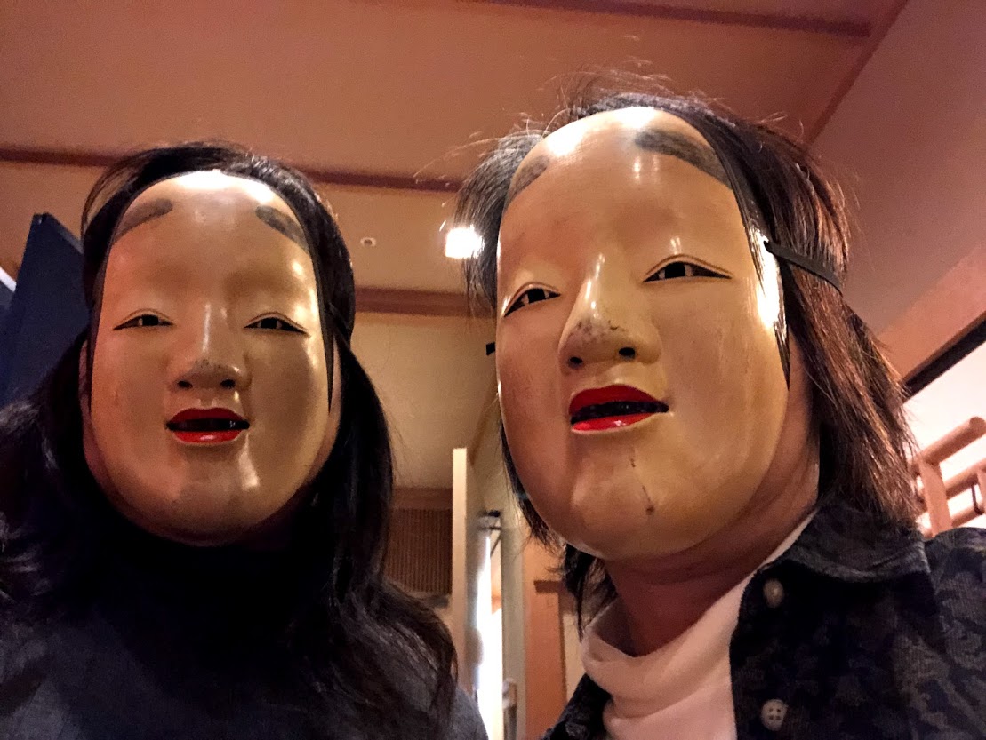 やっと能楽堂に到着。 お面をつけさせていただきました。 |