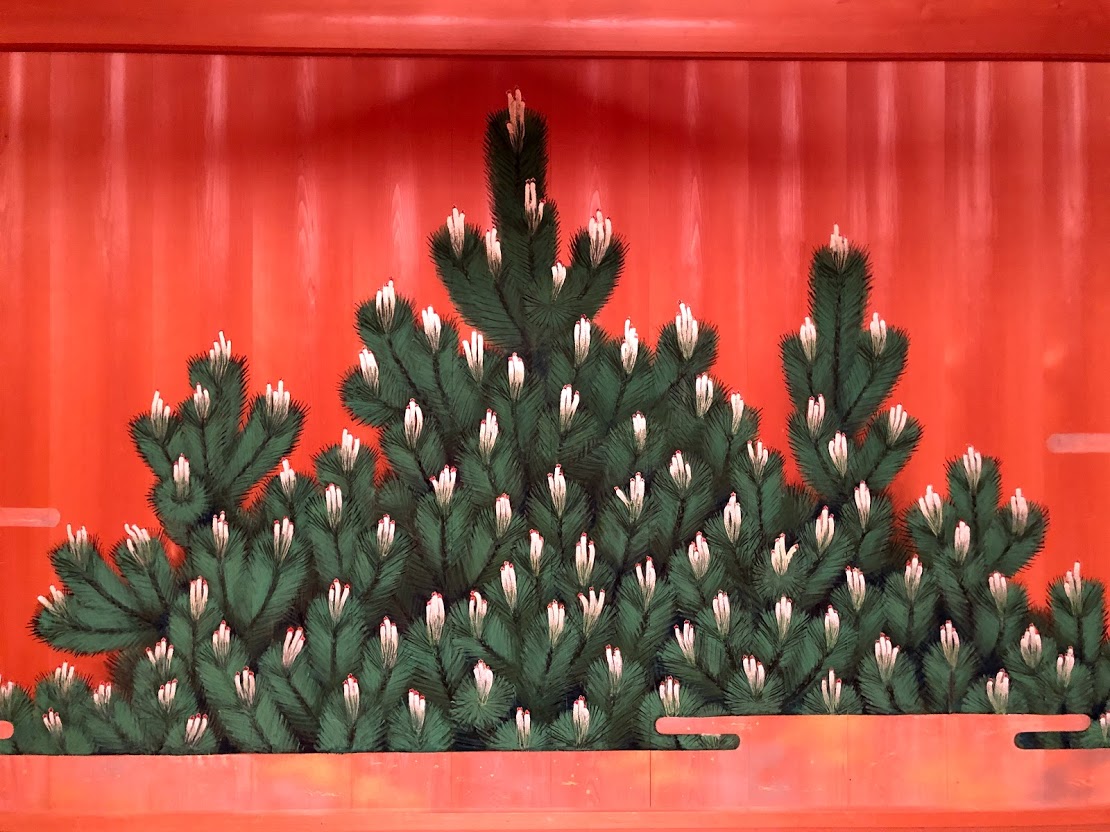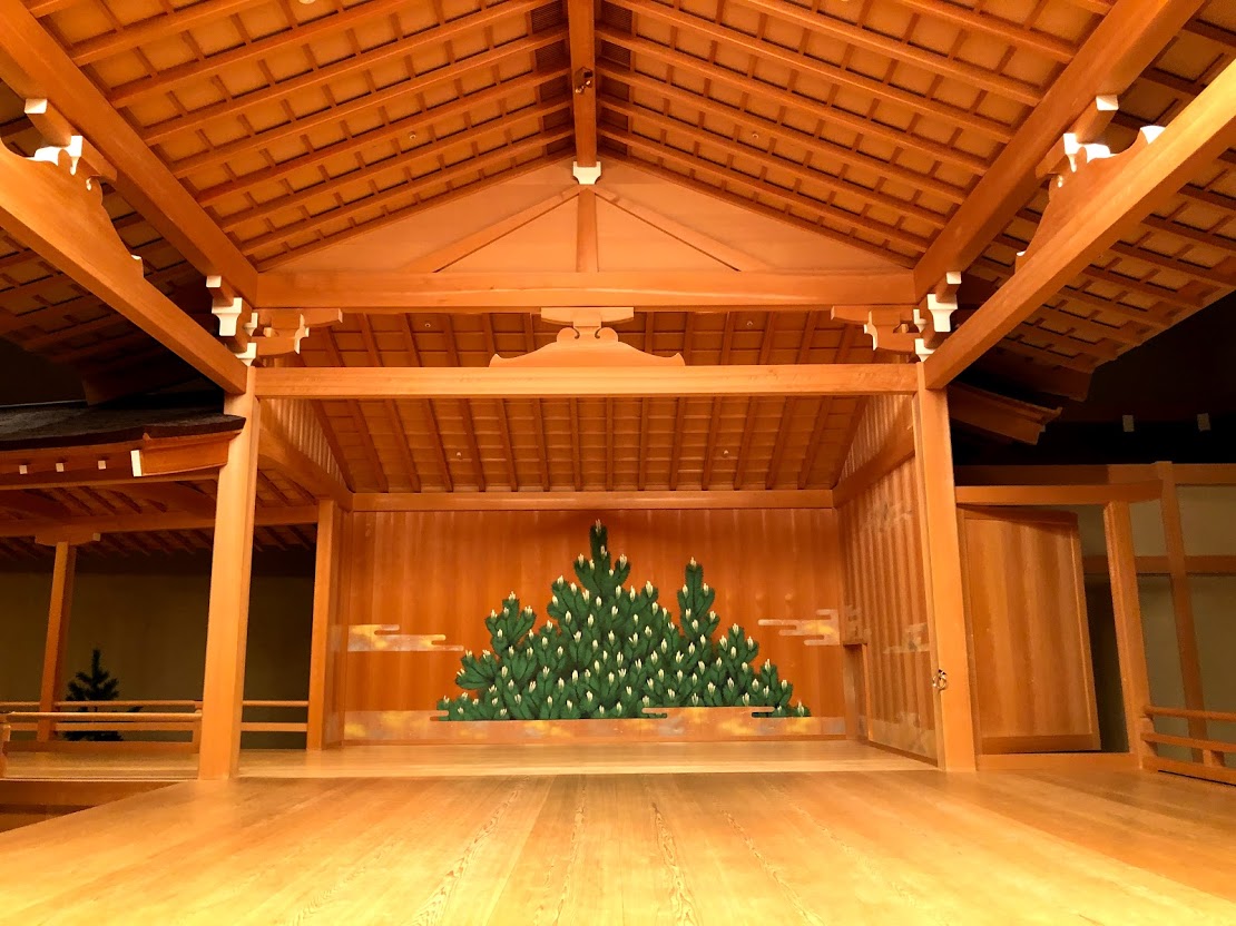 「鏡板」。 ふつうは「老松」が書かれていますが、名古屋能楽堂は「若松」が。 能楽堂が建設されたときに杉本健吉画伯が「若松」を描き、物議を醸しました。 結局隔年で「老松」と「若松」がかけられることになりました。