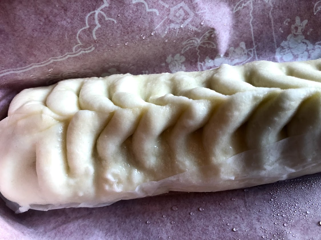 「ミステリアス・アイランド」 これ。「餃子ドッグ」です。 餃子の具を湯葉で包んでから蒸しパン生地で包んであるので、肉汁が逃げず、とってもジューシー |