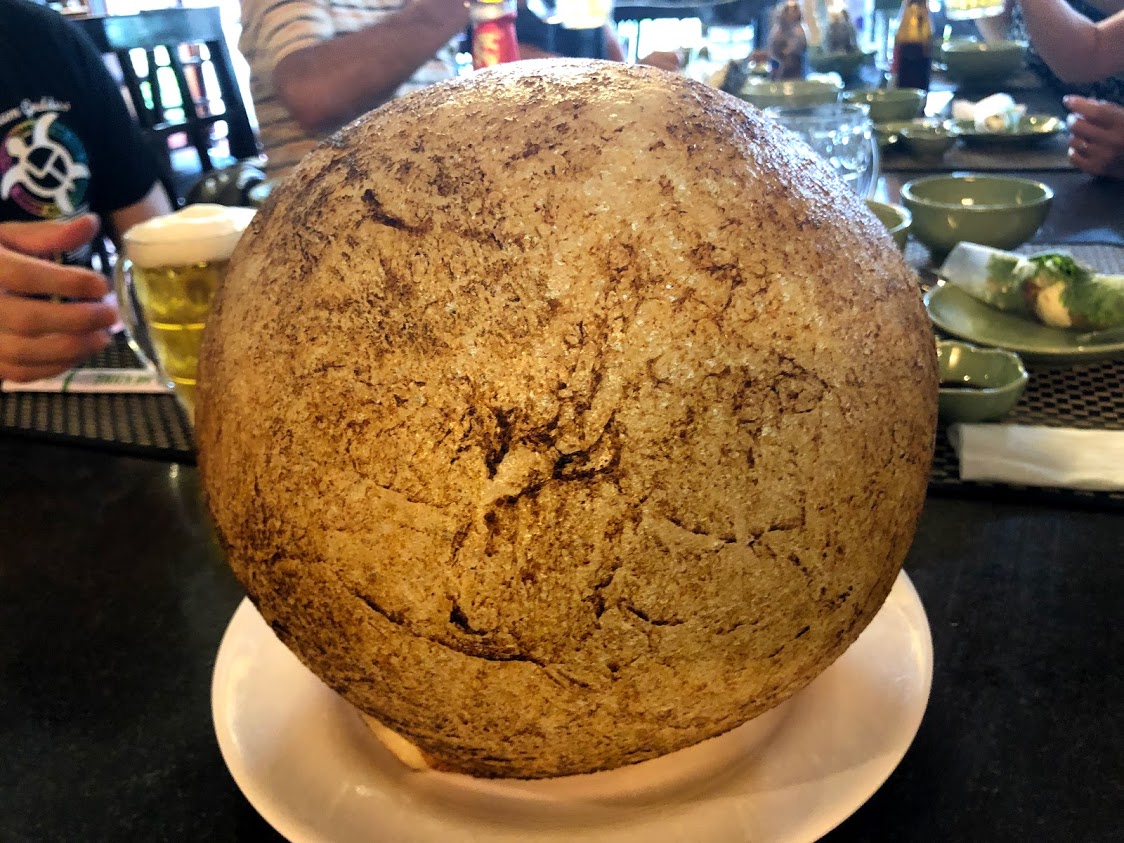 メコン郷土料理の「象耳魚」の唐揚げ。 お店の人が手でつかんでほぐしてくれます。 ワイルドなお料理。 |