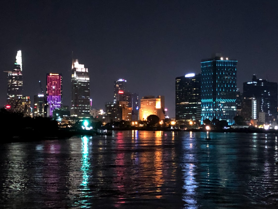 サイゴン川から見る「ホーチミン」。 川面にネオンが映ってきれいです。 |