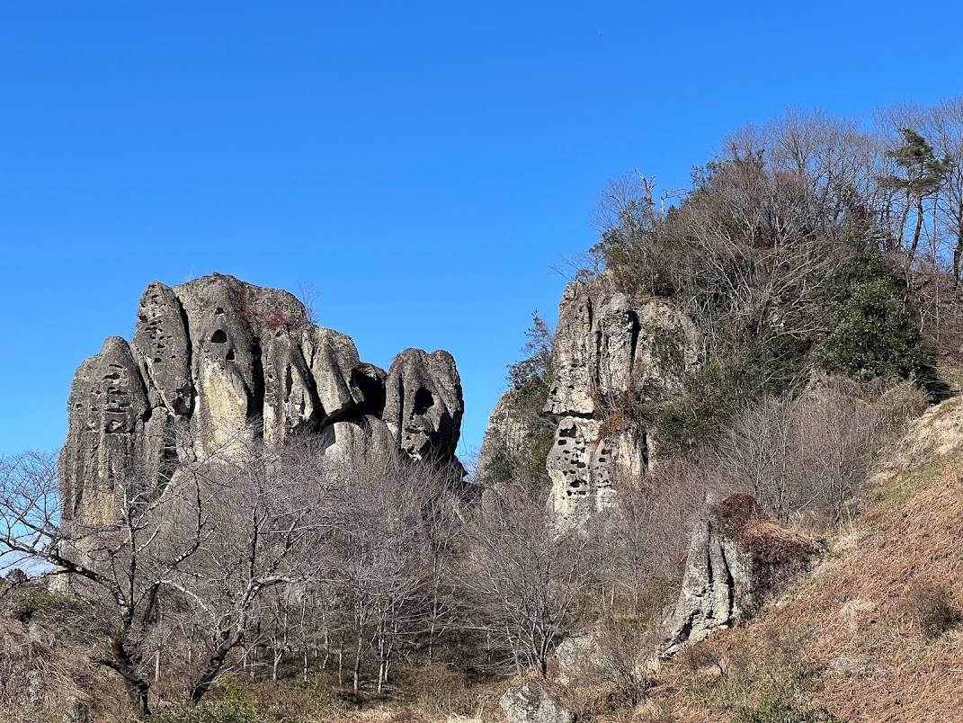 少し歩くと平和観音が見えてきます。 採石場のあとの岩壁に掘られた観音様。高さは27メートル。階段で展望台まで登ると町並みを一望することができます。この大観音像は、戦没者の慰霊と世界平和を祈念するためにすべてが手彫りで制作されています。でっかくて迫力あるよ。 |